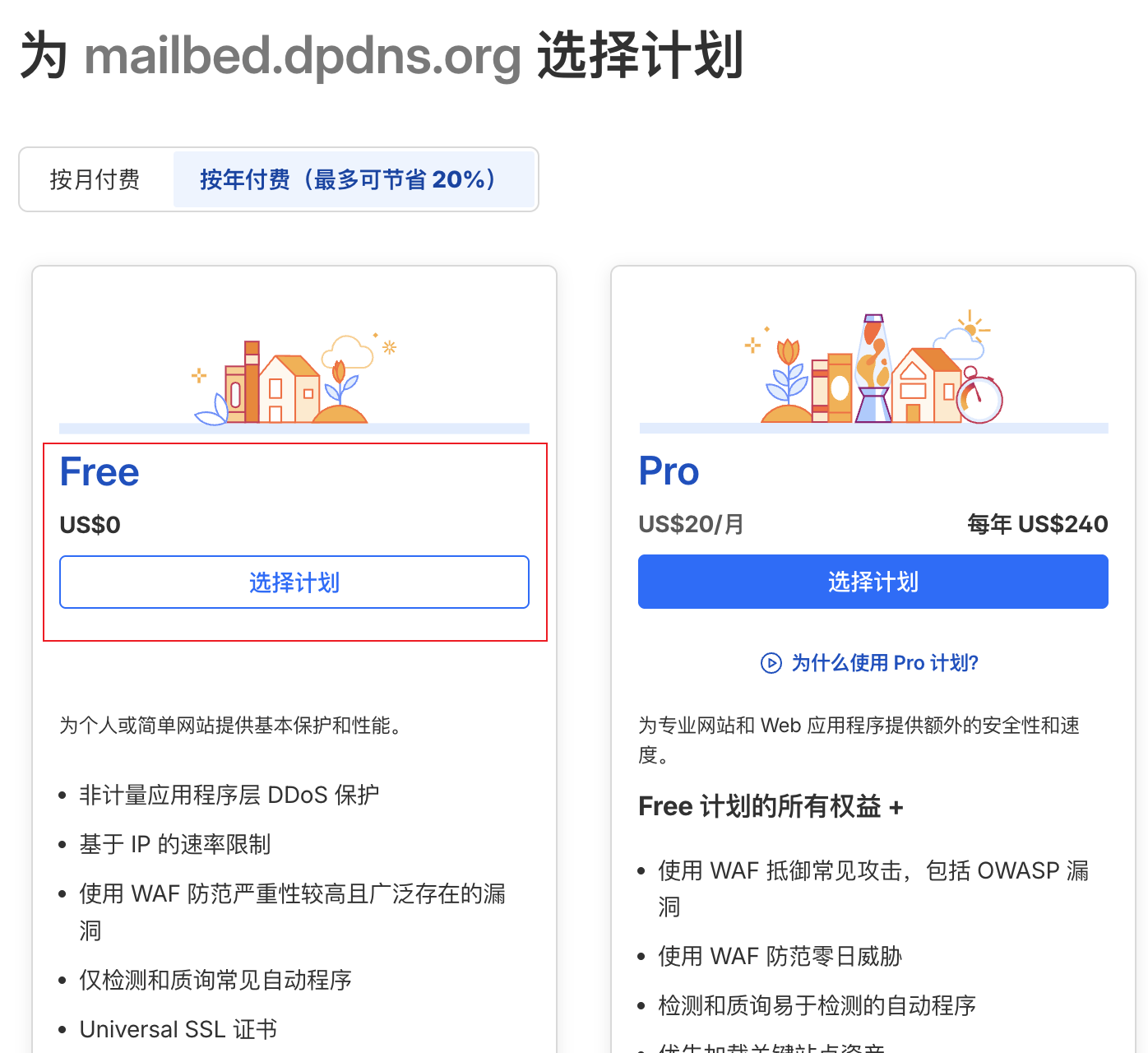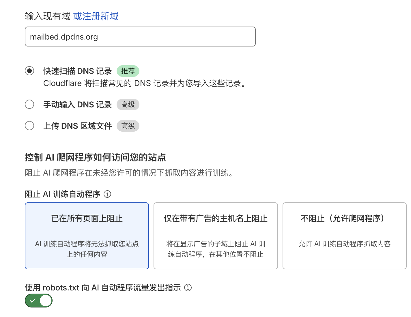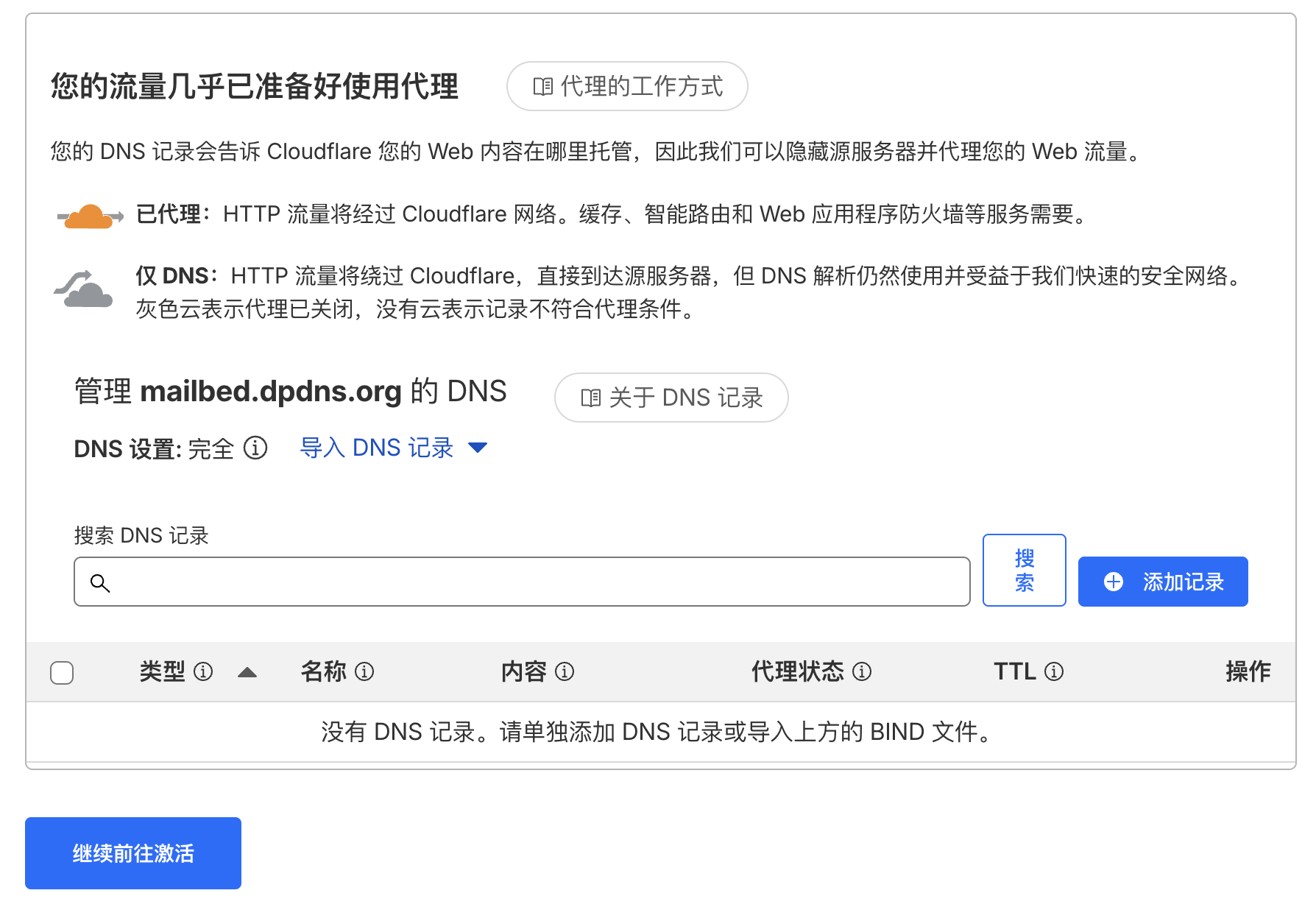 4、登陆Cloudflare后点出添加→连接域,输入刚才注册的二级域名,如Mailbed.dpdns.org,选择免费计划进入下一步,提示添加记录,点确认即可。