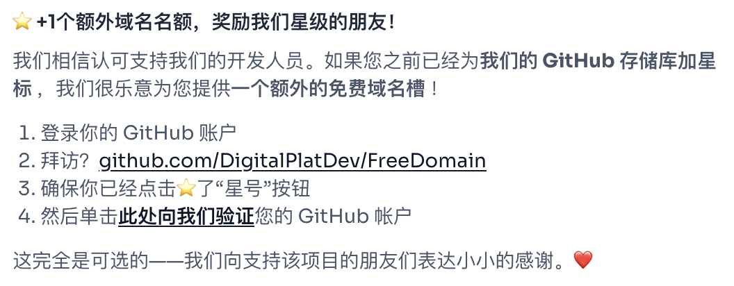 1、正常情况下,只提供1个二级域名的注册,关注官方github帐号后可增加1个名额;