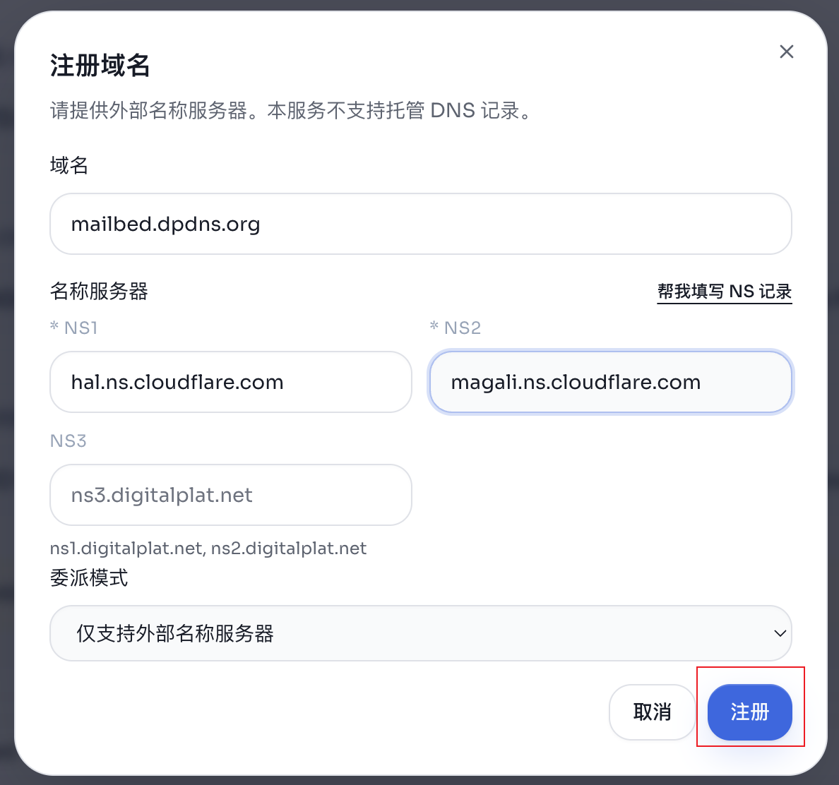 2、注册成功登陆后点击左则菜单栏【注册】,填入心仪的域名,选择喜欢的后缀,点击检查可用性,出现需要填写NS地址代表域名可注册;